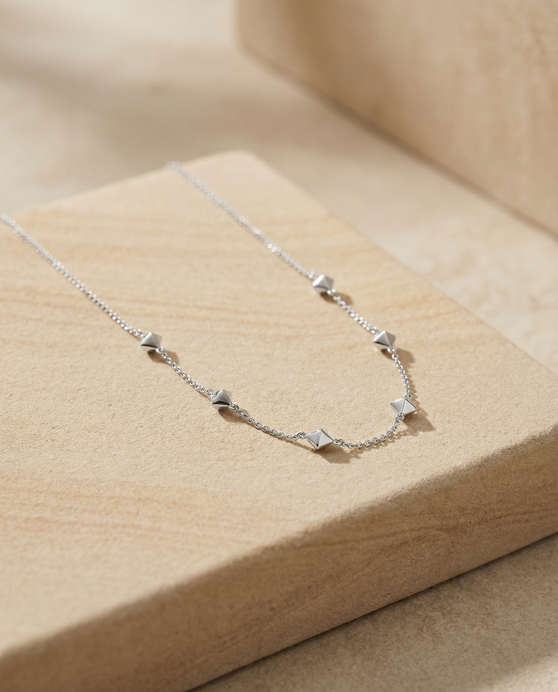 Sechs fein gearbeitete Pyramidenelemente aus hochwertigem Sterling Silber reihen sich elegant aneinander und symbolisieren Stärke, Wachstum und deinen ganz persönlichen Weg. Das klare, minimalistische Design legt sich leicht um deinen Hals und begleitet dich mühelos durch den Alltag – ein sanftes, aber kraftvolles Statement deiner inneren Stärke.
