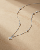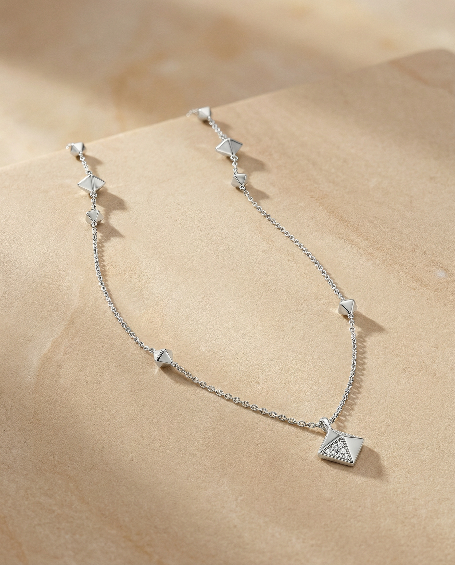 Entlang der feinen Kette setzen dezente Pyramidenelemente klare Akzente und symbolisieren innere Stärke und Selbstsicherheit. Im Zentrum glänzt ein größerer Pyramid-Anhänger mit funkelnden Zirkonia – ein Statement voller Klarheit, Eleganz und Selbstbewusstsein.