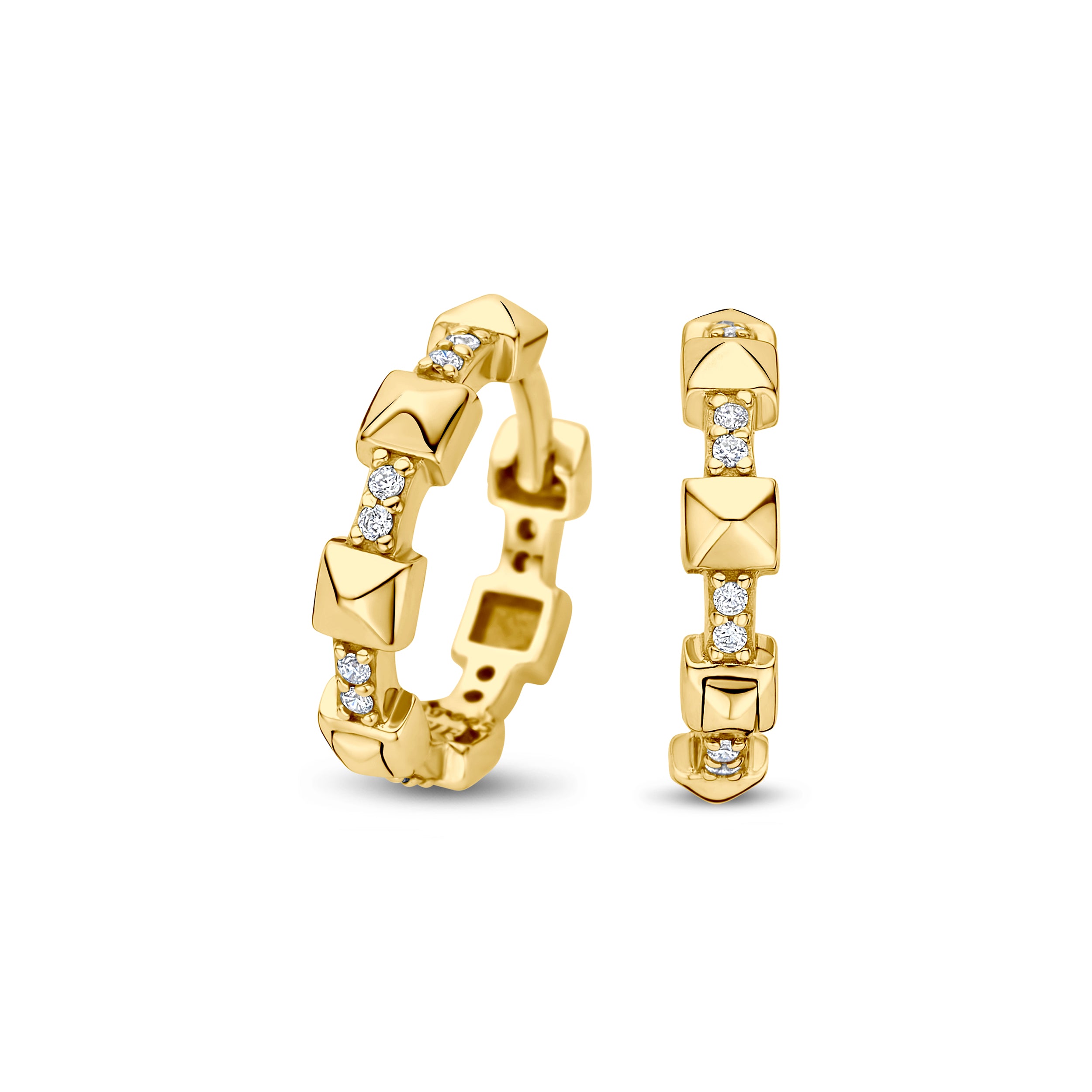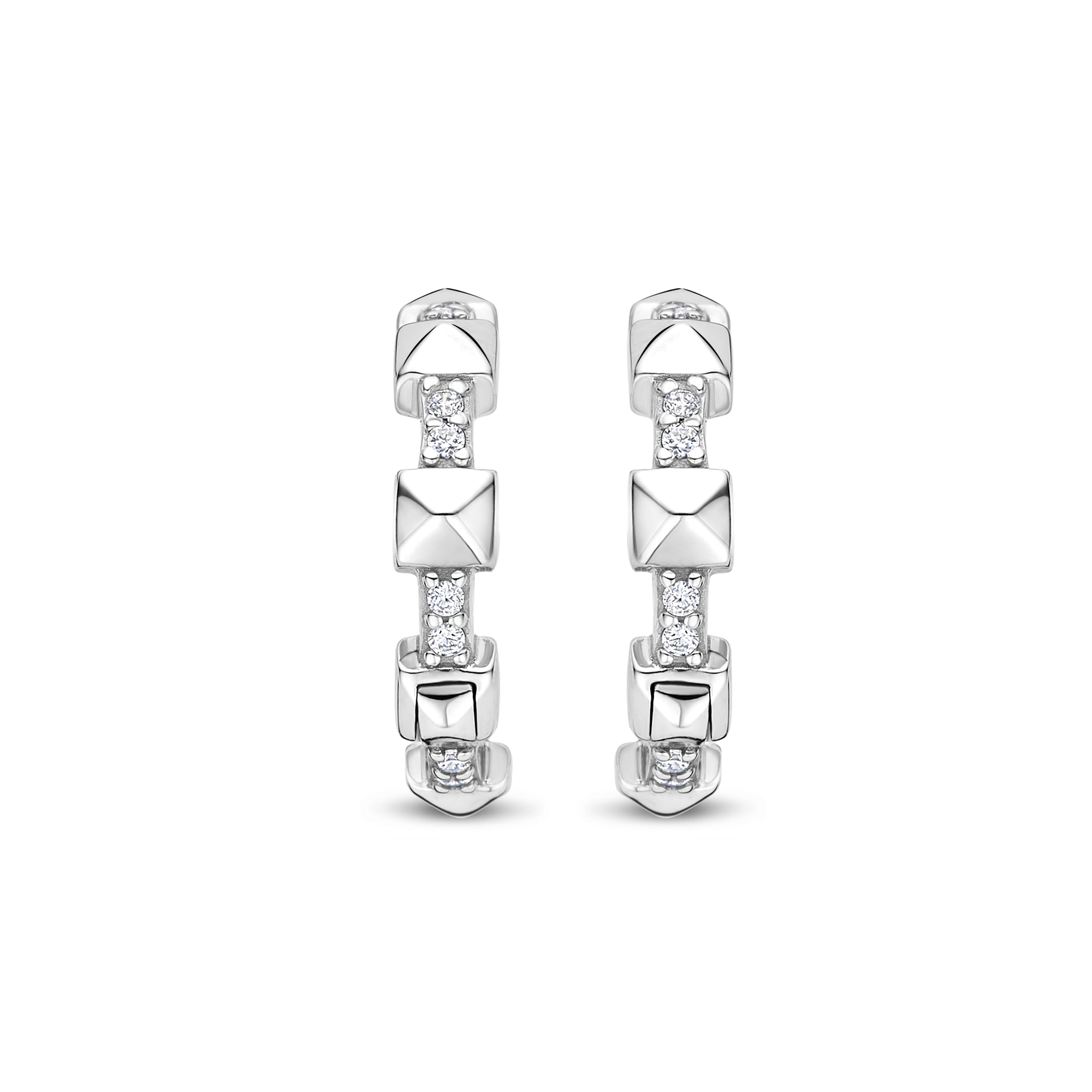 Diese Hoops sind für alle, die das Besondere suchen: Sechs ikonische Pyramidenelemente wechseln sich mit funkelnden Swarovski Zirkonia ab und erschaffen einen Look, der sowohl kraftvoll als auch elegant wirkt.